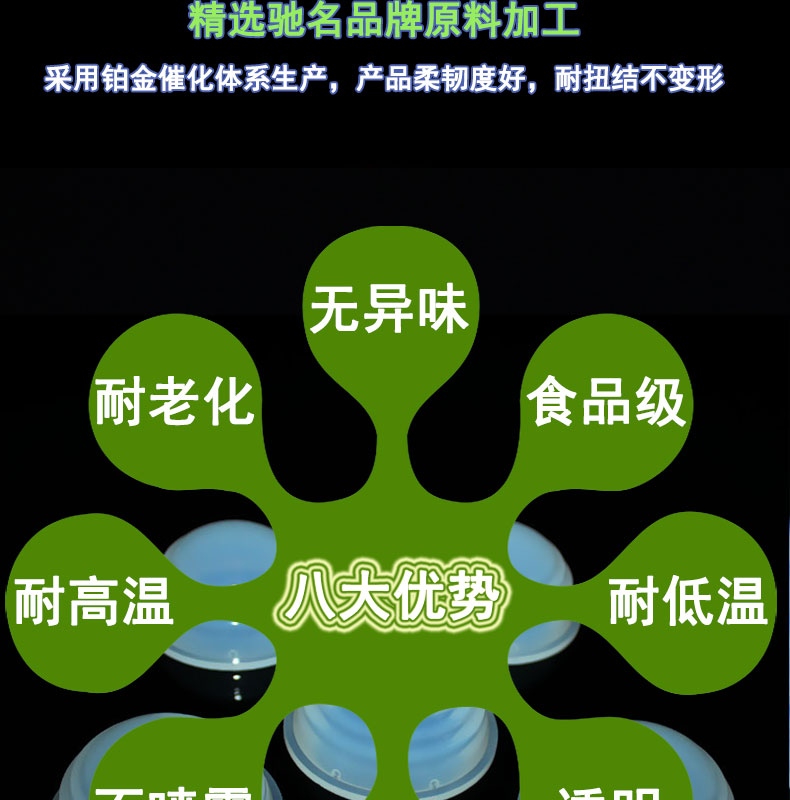 進口硅膠原材料,高溫硫化一體成型,有良好的生理穩(wěn)定性,內(nèi)壁平滑;常規(guī)硬度60度(邵氏硬度值30-90度);耐溫-50~+280℃,可以適應高、低溫設備需求,并耐老化。常規(guī)PE袋+紙箱包裝,特殊要求可按客戶標準;產(chǎn)品符合SGS、FDA、LFGB、生物相溶性等;常用于保健,醫(yī)療醫(yī)用器械、勞保、生活保健、生活用品等。