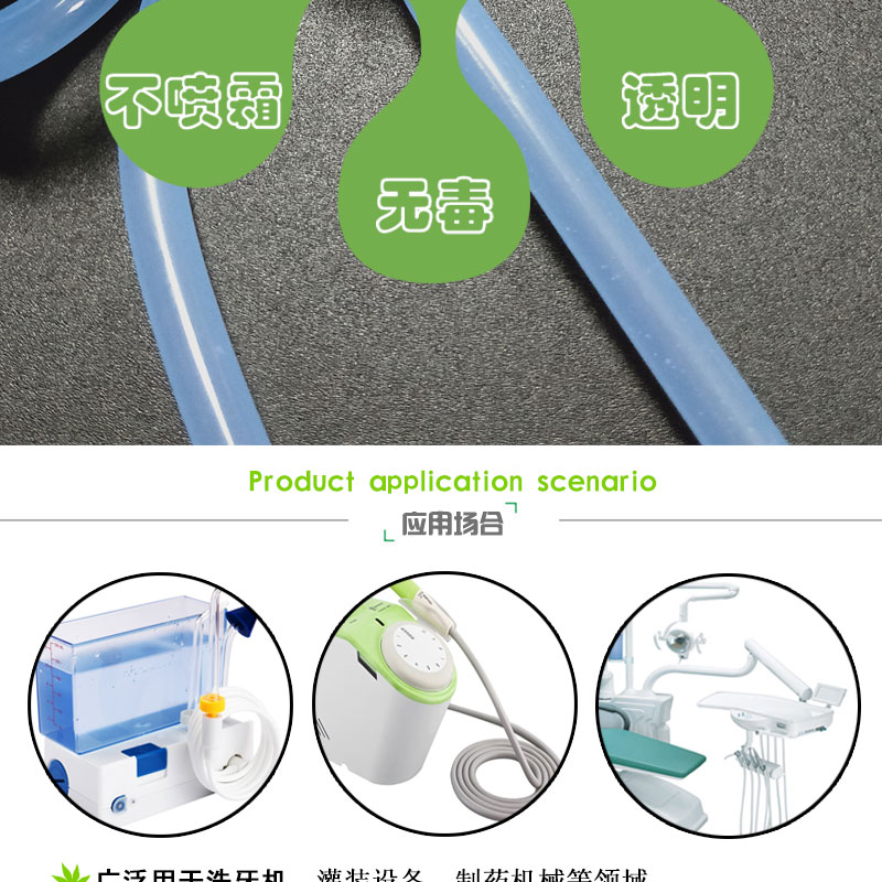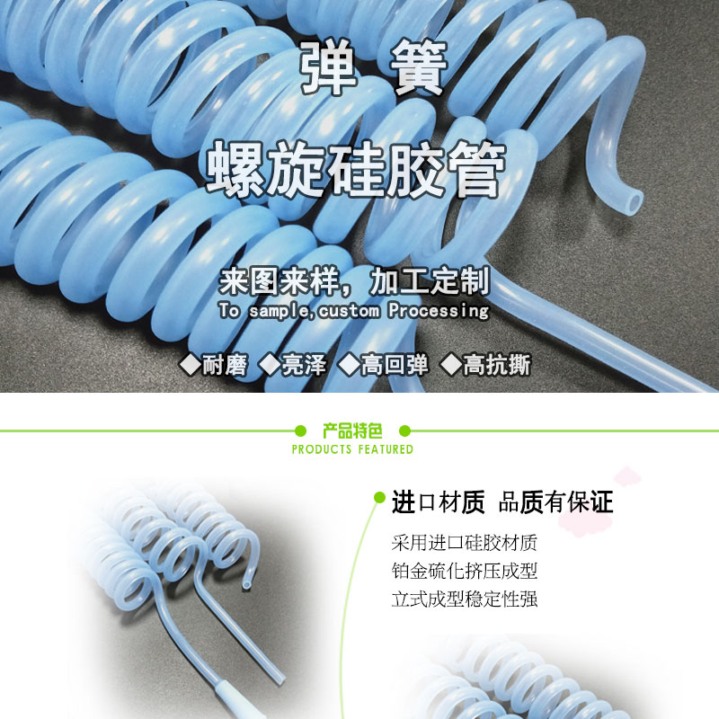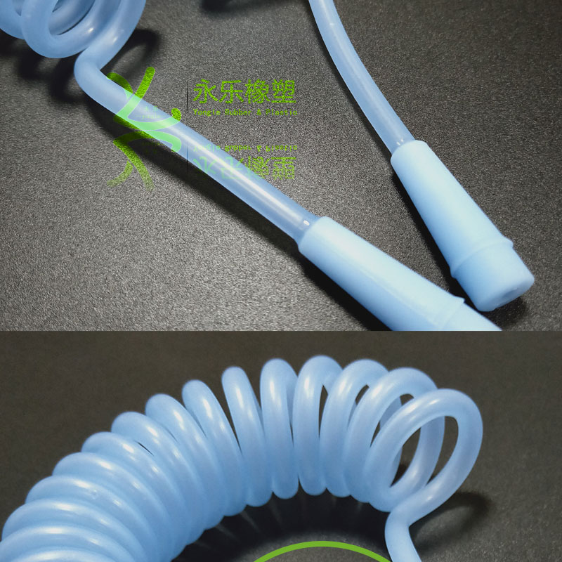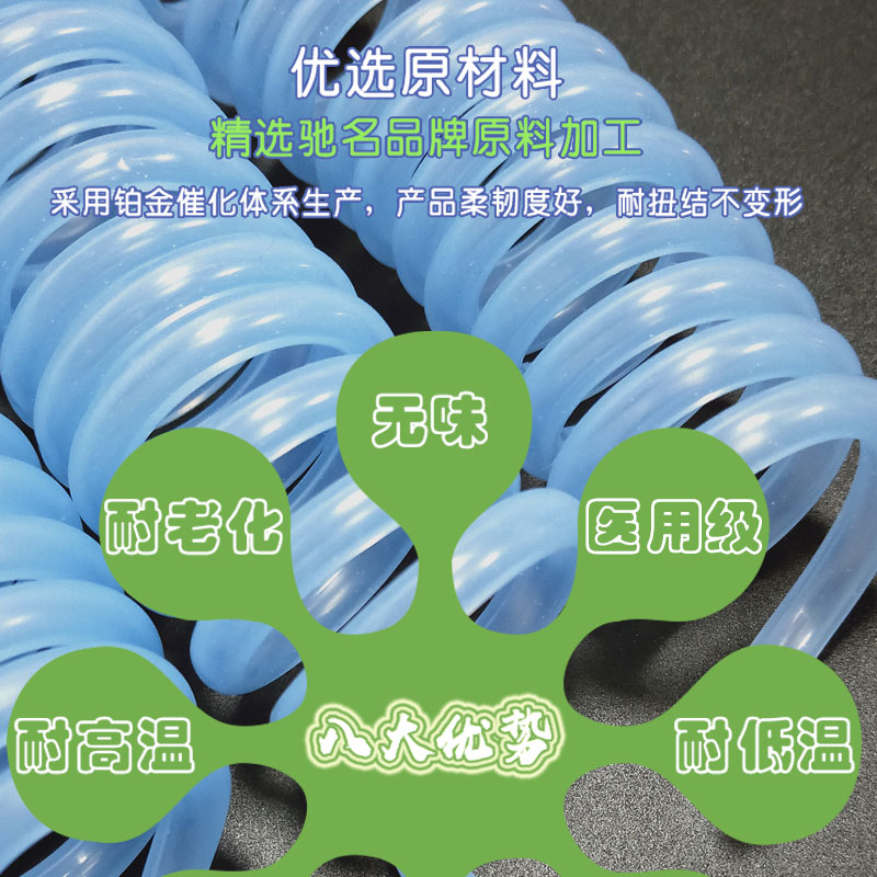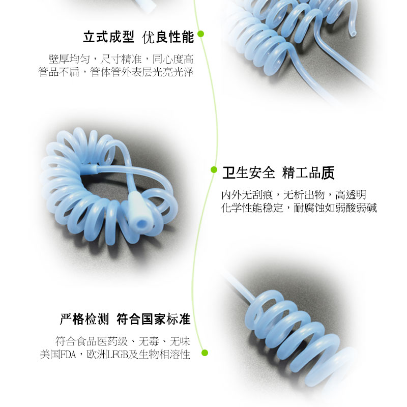 彈簧拉伸式硅膠管: 采用特種硅膠原材料,連續(xù)擠出成型,內(nèi)壁平滑;常規(guī)硬度70度(邵氏硬度30-80度);耐溫范圍廣(-50~+280℃),可以適應(yīng)高低溫設(shè)備需求,并耐老化。常規(guī)PE袋+紙箱包裝,特殊要求可按客戶標(biāo)準(zhǔn);產(chǎn)品符合SGS、FDA、LFGB、生物相溶性等;用于醫(yī)療激光洗牙機,醫(yī)用設(shè)備、呼吸傳送等設(shè)備。
