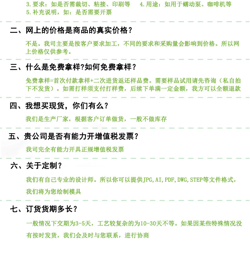| 產(chǎn)品硬度 | 20-80A | 打樣時間 | 7天內(nèi) | 產(chǎn)品樣板 | 現(xiàn)樣免費(fèi) |