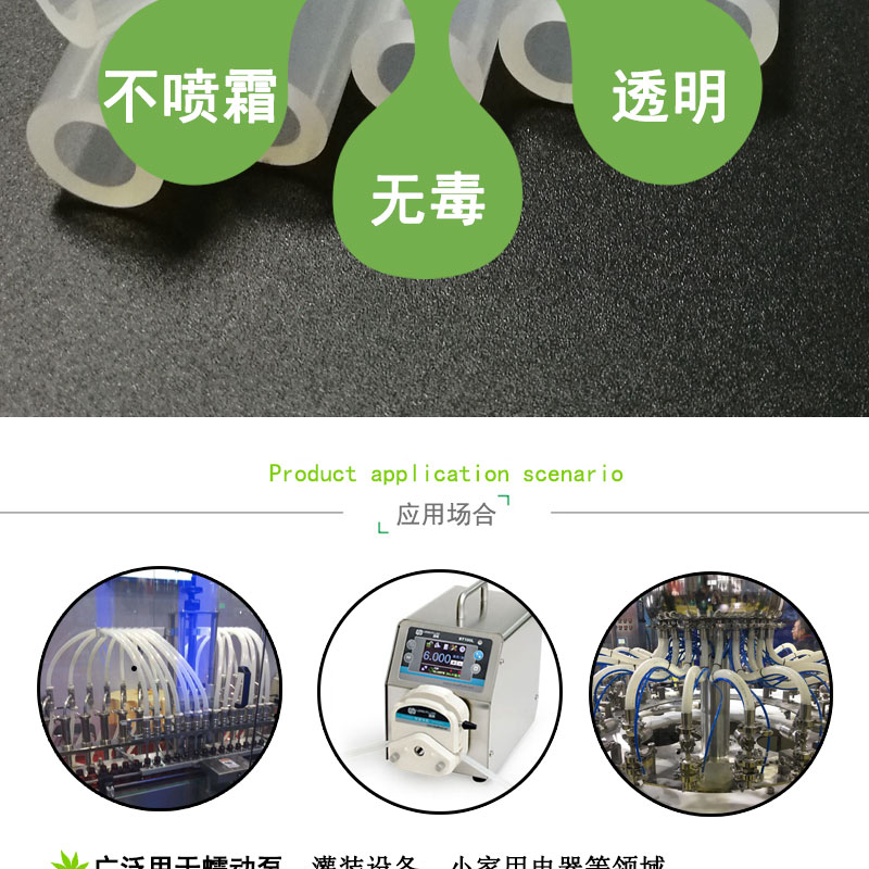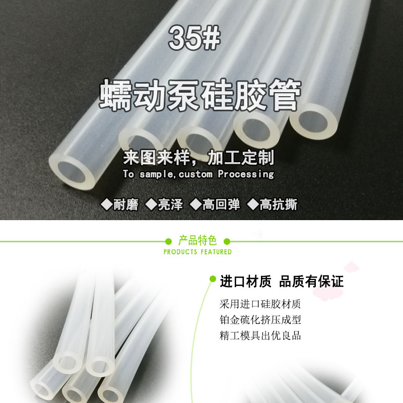 35#蠕動泵硅膠管:采用進口硅膠原材料,連續(xù)擠出一次成型,內壁平滑;常規(guī)硬度60度(邵氏硬度值30-90度);耐溫范圍廣(-50~+280℃),可以適應高、低溫設備需求,并耐老化。常規(guī)PE袋+紙箱包裝,特殊要求可按客戶標準;產品符合SGS、FDA、LFGB、生物相溶性等;用于灌裝機、蠕動泵專用、醫(yī)療醫(yī)用器械、輸液泵等。